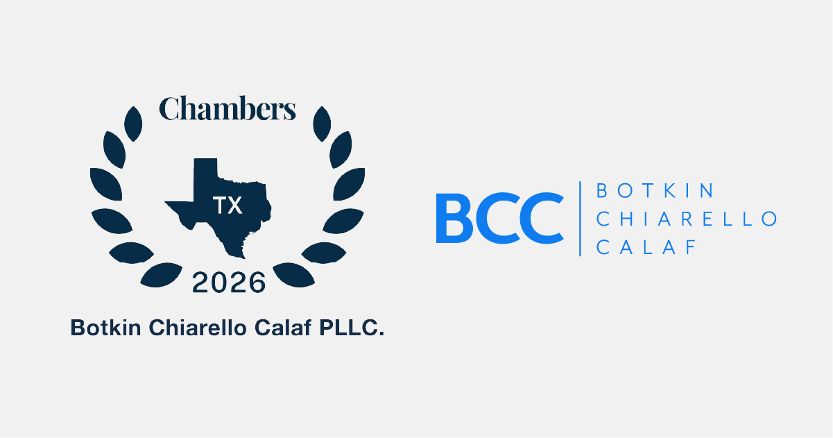 Botkin Chiarello Calaf has earned its third straight selection among Texas’s top boutique law firms for commercial litigation and intellectual property disputes in the 2026 Chambers USA Spotlight Guide published by London’s Chambers and Partners.